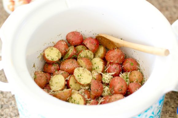 Tranchez les pommes de terre en deux et déposez-les dans la mijoteuse.