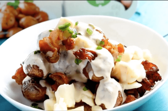 Pour assembler : déposer les pommes de terre sur une assiette. Ajoutez le fromage en grains et la sauce sur le dessus. Si vous le désirez, garnir de bacon et piments jalapenos.