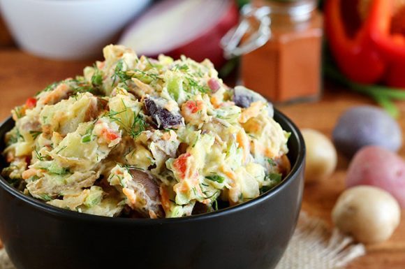Dans un petit bol, combinez la mayonnaise végétalienne, le jus de cornichon, le paprika, ¼ c. à thé de sel et de poivre noir. Ajoutez la vinaigrette aux pommes de terre chaudes. Mélangez le tout à l’aide d’une fourchette, en les écrasant légèrement afin d’épaissir la vinaigrette. Laissez les pommes de terre refroidir au réfrigérateur ou au congélateur jusqu’à ce qu’elles soient à la température ambiante ou plus froide. Ajoutez délicatement les ingrédients restants : les carottes, le céleri, l’aneth, les cornichons, l’oignon rouge, l’oignon vert, le poivron rouge et vert. Goûtez et ajustez l’assaisonnement au goût.