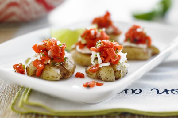 Tartiner chaque crouton de pomme de terre avec un peu de fromage à la crème et garnir de tartare de saumon fumé. Servir.