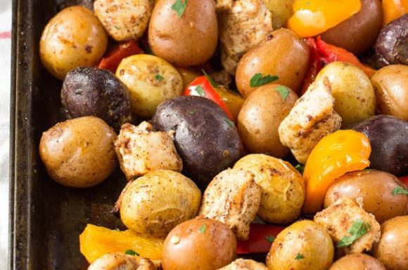 Line a rimmed baking sheet with tin foil (if desired). To the baking sheet add all ingredients. Toss (your hands work best!) until the chicken, potatoes and peppers are well coated with oil and spices.