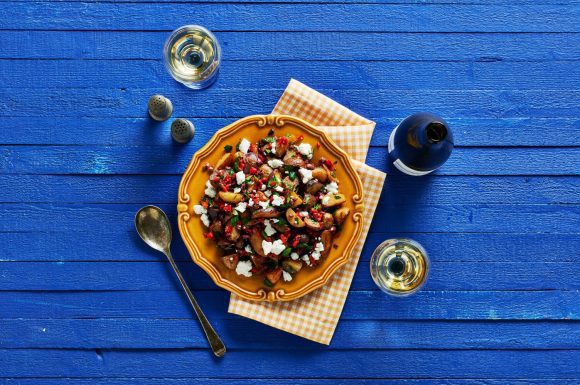 This pan-fried potato variation calls for salty olives, roasted red peppers, and goat cheese to bring a delicious, charcuterie-inspired French taste to your potatoes.