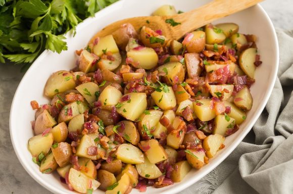 This German potato salad is made with red potatoes, bacon, and a homemade dressing made of sautéed onion, apple cider vinegar, and bacon drippings. Serve it warm or chilled and enjoy!
