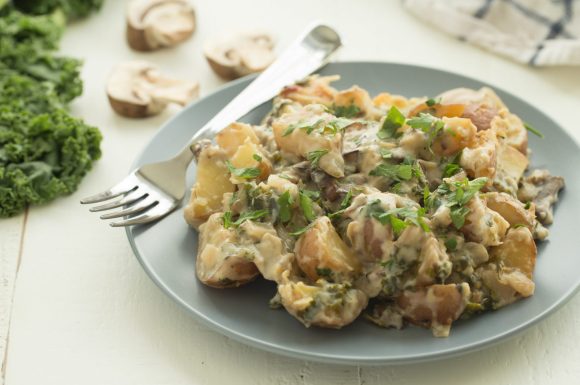 The perfect side dish for a festive feast! Kale, mushrooms and little potatoes baked with creamy Parmesan cheese.