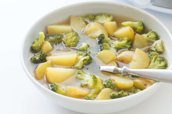 A slow cooker soup made with broccoli, little potatoes, onions, and garlic. With just five ingredients you can be enjoying this simple recipe for dinner.
