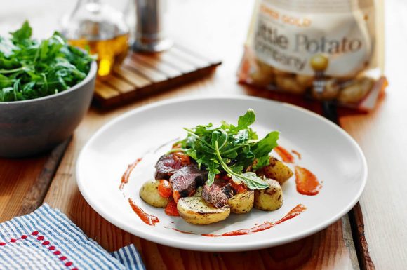 A flavor-packed, decadent dinner with smoky aromatics. Romesco is a Spanish sauce from Catalonia and is a perfect complement to smoked sirloin and Creamer potatoes.