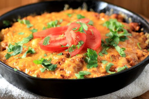 Place the cast iron pan into the oven and bake for 20 to 25 minutes until the cheese is melted and it is all heated through.