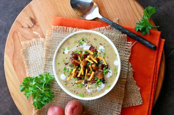 Pour back into your skillet or saucepan to reheat. If you reserved any baked potatoes for a chunkier texture, mash the with a fork, and add them to the soup along with the vegan cheddar, coconut milk, and chives. Heat over medium low until the cheese is melted.
